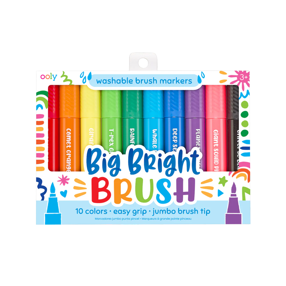 Experience vibrant and bright coloring with a set of brush tip markers that are great for that young budding artist. Washable ink and chunky barrels make Big Bright Brush Markers the perfect set of jumbo makers that make art fun!