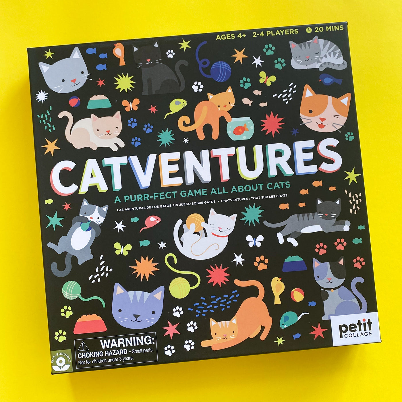 Answer questions and act out silly things cats do in this a-meow-sing Catventures Game from Petit Collage! Includes 1 gameboard, 4 wooden cat characters, 1 wooden die and 51 action cards in English, Spanish and French. Printed with non-toxic inks. Ages 4+. 20 min playtime.