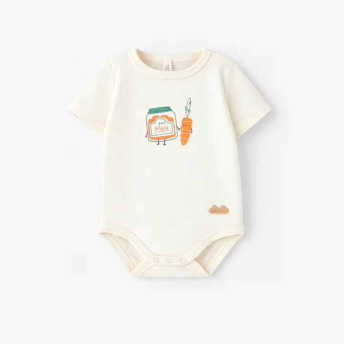Cream bodysuit with a fun illustration of a carrot and purée! illustration! Features a round neckline and short sleeves, with snap buttons at the inseam for easy dressing. Made of stretchy cotton jersey.
