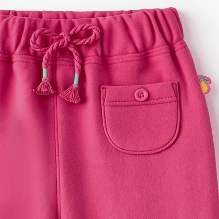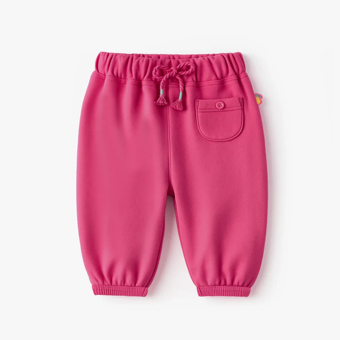 Dark pink jogger pants, featuring an elastic waistband with a drawstring. Includes elastic cuffs. Made from comfortable French terry in a relaxed fit.