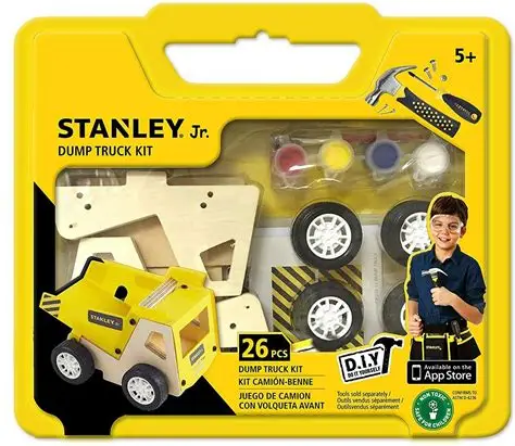Challenge your children's imaginations while keeping them active and engaged with this fun STANLEY Jr. Wooden DIY Kit - Dump Truck project. Help develop their hand-eye coordination, fine motor skills, problem-solving skills and creativity while building their very own wooden Dump Truck toy from scratch. For ages 5 and up.