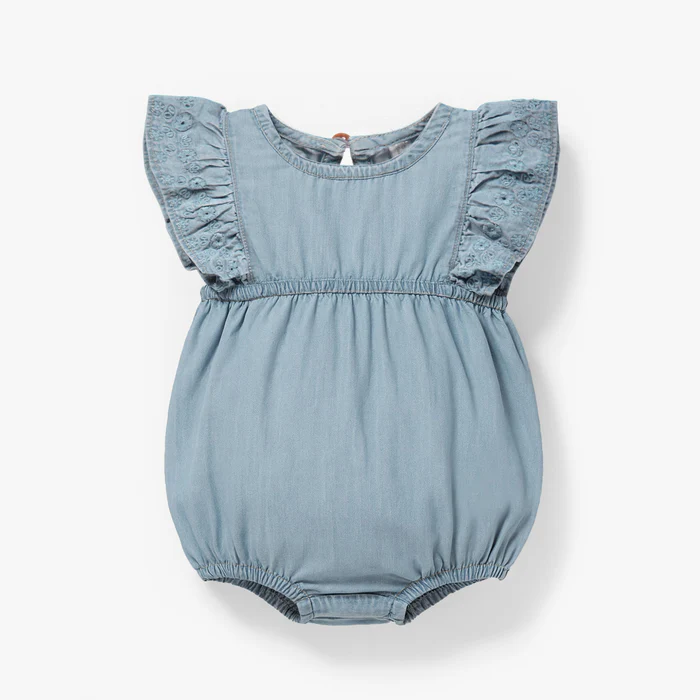 Light blue denim romper with flutter sleeves trimmed in broderie anglaise. Features a round neckline, a small back opening, and elasticized leg openings. Made of lightweight, comfortable denim.