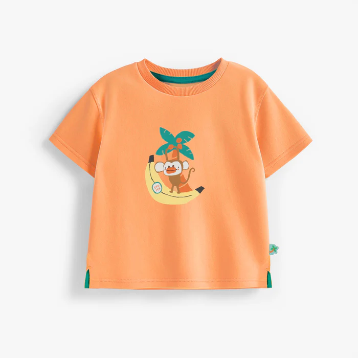 Orange T-shirt with a fun illustration of a monkey on a banana and a palm tree. Features a round neckline and short sleeves. Made from cotton jersey in a relaxed fit for maximum comfort.
