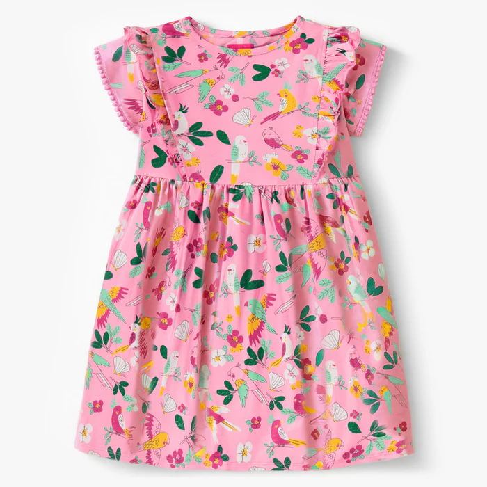 Pink dress with tropical bird and flower prints. Features ruffles on the bodice and scalloped short sleeves for a totally feminine look. Made of stretch cotton jersey in a regular flared fit.