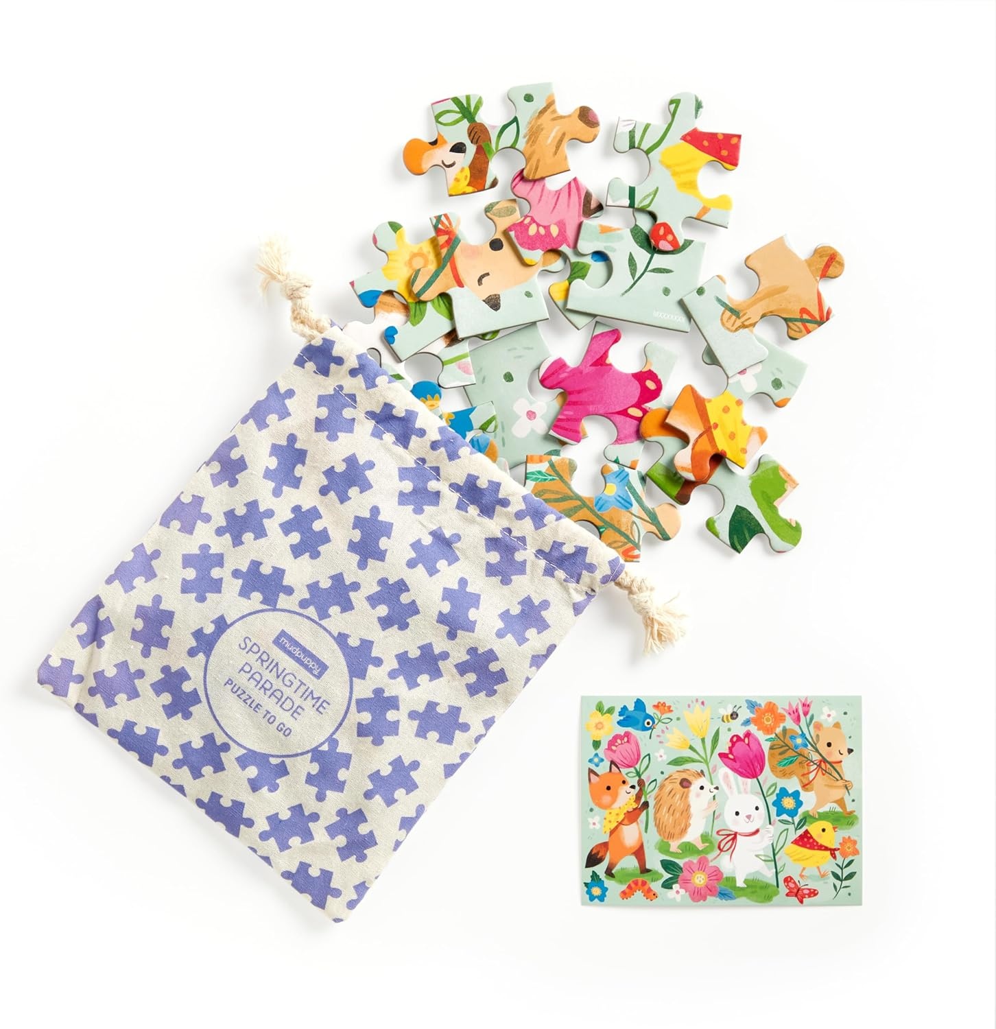 Springtime Parade 36 Piece Puzzle To Go, which comes packaged in a 100% cotton drawstring bag, features adorable artwork of animals parading during the springtime. This puzzle is just the right level of challenge for children ages 3 and up! The box includes a fun postcard with the full puzzle image for reference. This puzzle is easy to throw in a suitcase or tote bag, and when assembled, the puzzle fits just right on an airplane tray, making it perfect for travelling or just being out and about.