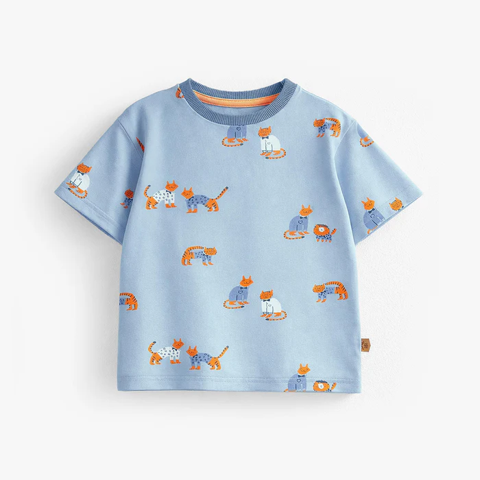 Blue T-shirt with fun tiger prints. Features short sleeves and a round neckline. Made from comfortable cotton jersey in a regular fit for maximum comfort.
